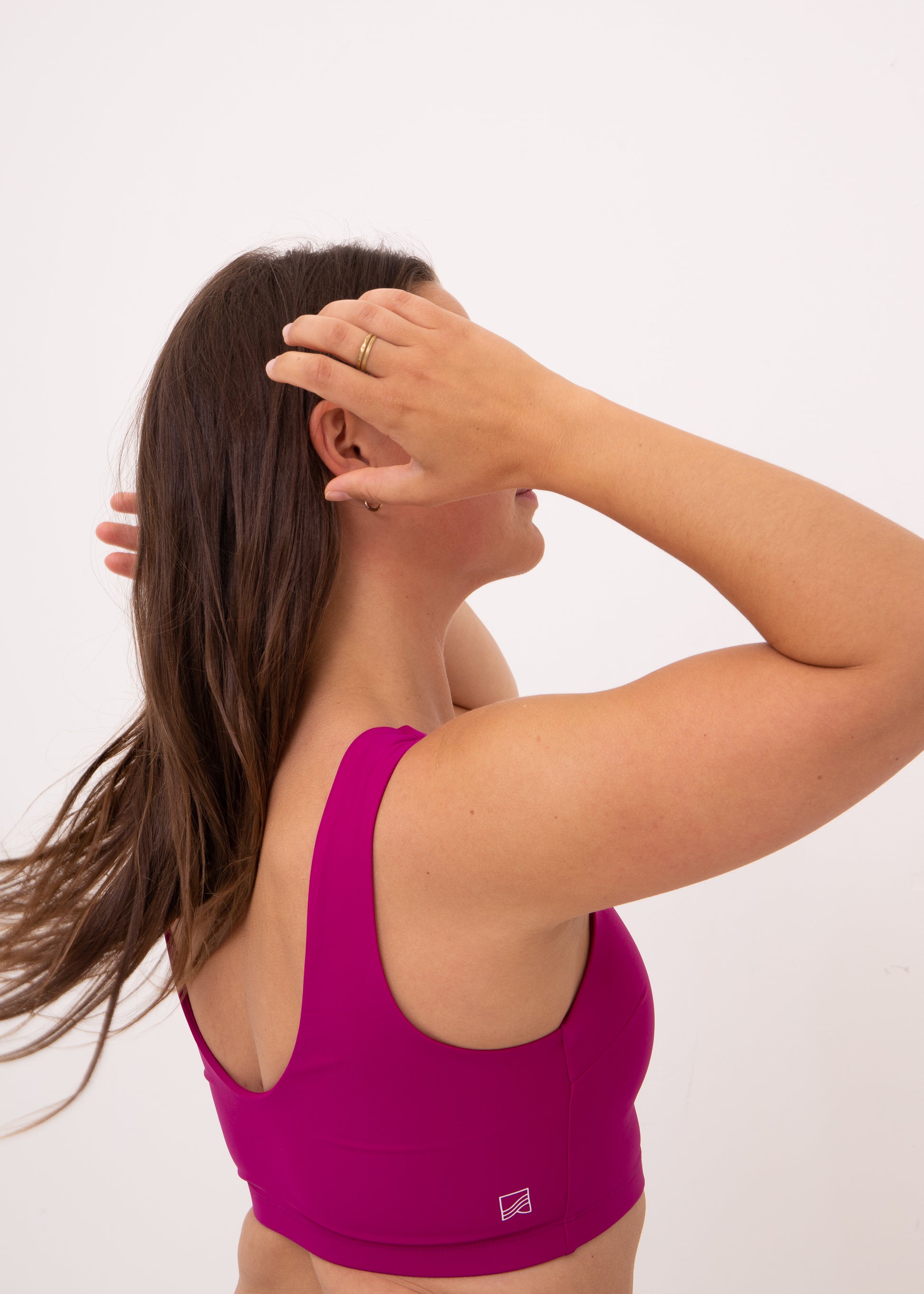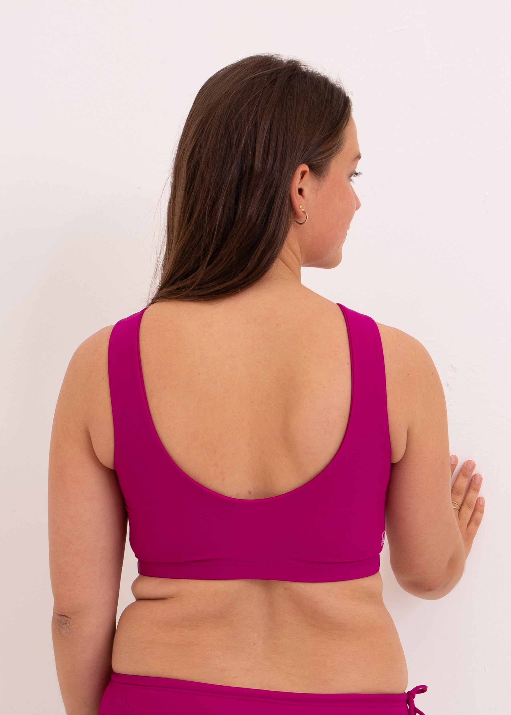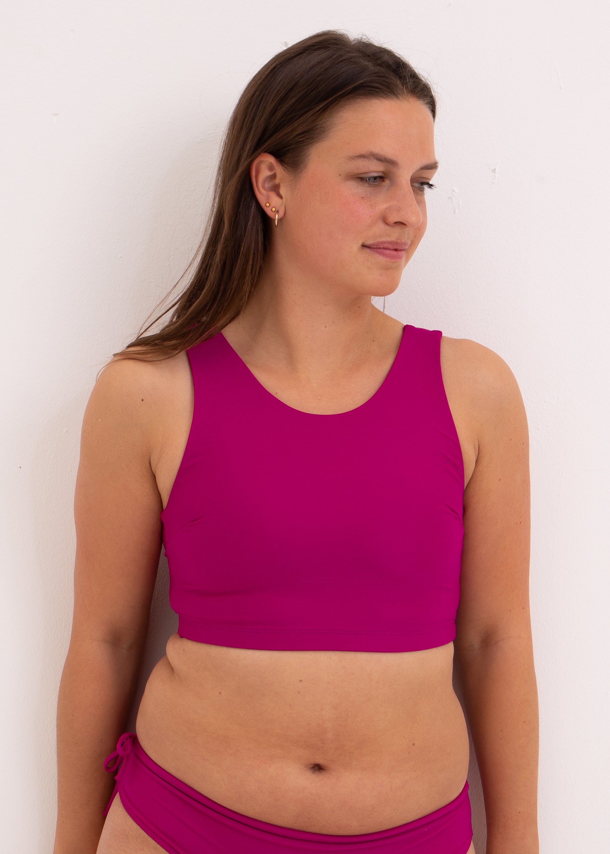 Surfing, Yoga or any sporting activity is even more fun with our Top "JESS". The high neckline protects from the sun, leaves everything in place doing handstand and the low cut back makes it airy and easy to move in.